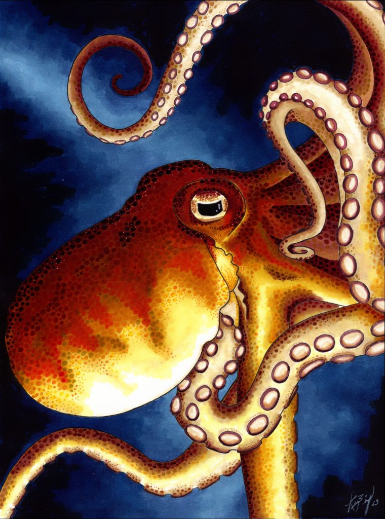 My drawings are done on watercolor paper with alcohol pens and fine line markers. As with my felting, the inspiration for my drawings come mainly from nature, sea life, and birds.